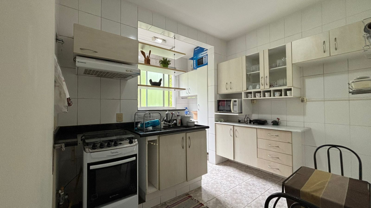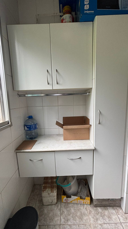 O banheiro é funcional e bem distribuído. A cozinha possui armários e integra-se à área de serviço por meio de uma divisão bem planejada, feita com estante que delimita os ambientes de forma prática e harmoniosa, mantendo a independência dos espaços sem comprometer a circulação.