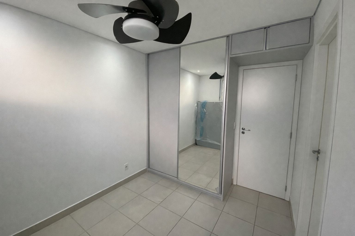 O apartamento possui dois quartos, sendo uma suíte, ambos com armários planejados com espelhos, que aliam organização e elegância aos ambientes. Os banheiros social e da suíte são equipados com armários, espelhos e box em vidro, apresentando acabamento moderno e funcional. A área social é composta por uma sala ampla integrada à cozinha, com destaque para a parede marmorizada, painel planejado para TV e projeto de iluminação que valoriza o espaço e cria uma atmosfera acolhedora e contemporânea.